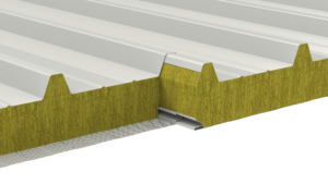 Self-supporting roof panel with double steel sheet and mineral wool core, for roofs with a slope of not less than 7%. 5-ridge profiled external sheet to increase resistance for static and dynamic loads. Visible fastening and clips with gasket.